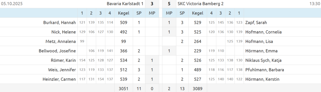 Annalena Metz wurde nach den ersten Würfen durch Josefine Bellwood ersetzt. Zusammen erkegelten sie gegen Melissa Müller 436 : 570 Holz bei 4:0 Punkten. Auch Jennifer Weis tat sich sichtlich schwer und schaffte es ebenfalls nicht gegen Anne Tonat mit 528 : 565 Holz bei 3:1 Sätzen für Bavaria zu punkten. Schlussendlich gewannen die Keglerinnen aus Oberhaid mit 7:1 Punkten und für Bavaria ernüchternden 222 Zählern.