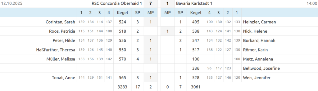 Eine derbe Niederlage kassierten die Bavaria Damen auswärts beim RSC Concordia Oberhaid in der Bayernliga Nord. Die Bahnen lagen den Unterfränkinnen überhaupt nicht und die eine oder andere Karlstadterin biss sich daran die Zähne aus. Völlig neben sich stand Carmen Heinzler, die gleich zu Beginn gegen Sarah Corintan mit 495 : 524 Holz und 1 : 3 Sätzen ins Hintertreffen geriet. Helene Nick konnte zwar mit 2 : 2 Sätzen und 538 : 518 Holz gegen Patricia Roos punkten, sich jedoch nicht weit genug absetzen, um den Rückstand aufzuholen.