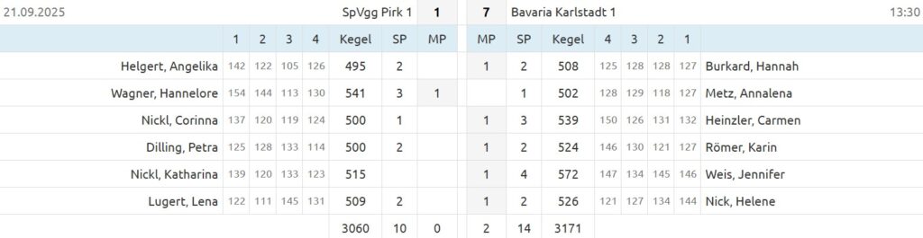 Jennifer Weis ließ ihrer Gegnerin, Katharina Nickl, nicht den Hauch einer Chance. Mit ihrer Tagesbestleistung von 572:515 Holz und 4:0 Sätzen, machte sie den Sack zu! Helene Nick musste im Prinzip gegen Lena Lugert nur noch verwalten. Dies gelang ihr mit ihren ordentlichen 526:509 Holz und 2:2 Sätzen. Somit siegten die Bavarinnen schlussendlich mit 7:1 Punkten und einem Gesamtergebnis von 3171:3060 Holz.