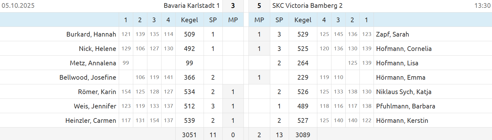Eine bittere Heimniederlage kassierten die Bavarinnen in der Bayernliga Nord gegen Victoria Bamberg 2. Dabei wäre ein Sieg oder zumindest ein Unentschieden durchaus drin gewesen. Resümierend wurde das Match schlichtweg in den ersten drei Paarungen aus der Hand gegeben. Bereits zu Beginn fand Hannah Burkard nicht zu ihrem derzeit gewohnt guten Spiel und unterlag Sarah Zapf mit 509:529 Holz bei 1:3 Sätzen. Auch Helene Nick wusste sich auf der Bahn keinen Rat und gab mit 492:525 Holz und 1:3 Sätzen gegen Cornelia Hofmann, Holz und Punkt ab. Annalena Metz wurde nach dem ersten Durchgang durch Josefine Bellwood ersetzt. Diese fand leider erst auf ihrer zweiten Bahn ins Spiel und vergab dadurch einen wichtigen Satzpunkt, was den Gastgeberinnen schlussendlich den Mannschaftspunkt kostete. Auf Seite der Bambergerinnen spielte zunächst Lisa Hofmann. Auch sie wurde ausgewechselt und durch Emma Hörmann ersetzt. Die Begegnung endete mit 465:493 Holz bei 2:2 Sätzen für die Gäste aus Oberfranken. Karin Römer holte als erste Bavarin ihren Punkt. Mit 2:2 Sätzen und 534:526 Holz gewann sie knapp gegen Katja Niklaus-Sych.