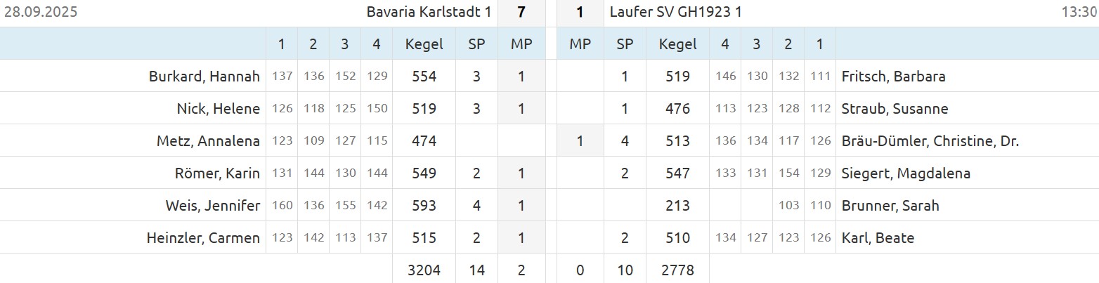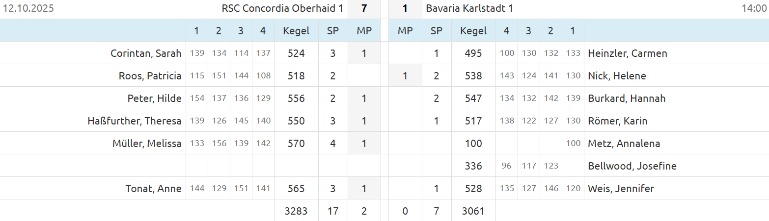 Annalena Metz wurde nach den ersten Würfen durch Josefine Bellwood ersetzt. Zusammen erkegelten sie gegen Melissa Müller 436 : 570 Holz bei 4:0 Punkten. Auch Jennifer Weis tat sich sichtlich schwer und schaffte es ebenfalls nicht gegen Anne Tonat mit 528 : 565 Holz bei 3:1 Sätzen für Bavaria zu punkten. Schlussendlich gewannen die Keglerinnen aus Oberhaid mit 7:1 Punkten und für Bavaria ernüchternden 222 Zählern.