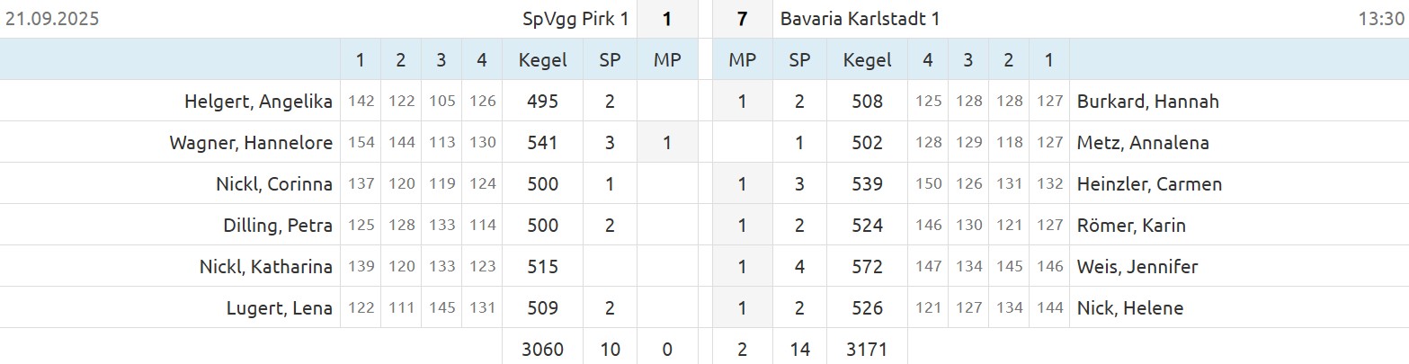 Der Saisonauftakt für die Damen von Bavaria Karlstadt ist geglückt! Mit zwei Punkten im Gepäck kamen sie von ihrem Auswärtsspiel aus der Oberpfalz, bei der SpVgg Pirk, zurück.Zunächst begann Hannah Burkard und traf auf Angelika Helgert. Mit 508:495 Holz und 2:2 Punkten, rettete sie den ersten Punkt auf die Habenseite der Bavaria. Annalena Metz hatte es mit Pirks Besten, Hannelore Wagner, zu tun. Bei 502:541 Holz und 1:3 Sätzen musste sie leider klein bei geben und ihren Mannschaftspunkt den Gastgeberinnen überlassen. Bis zu diesem Zeitpunkt führten die Oberpfälzerinnen mit 26 Kegeln.